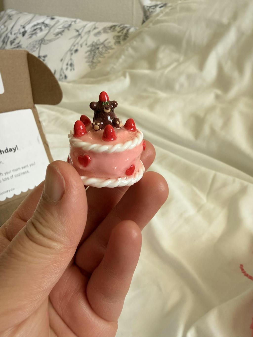 A miniature cozy bear with toe beans, but on a fun pink strawberry cake! 🍓