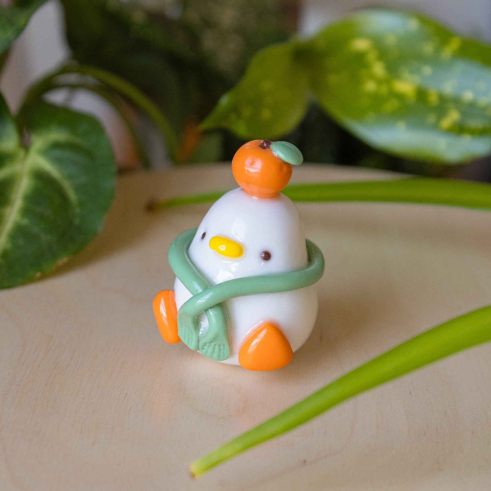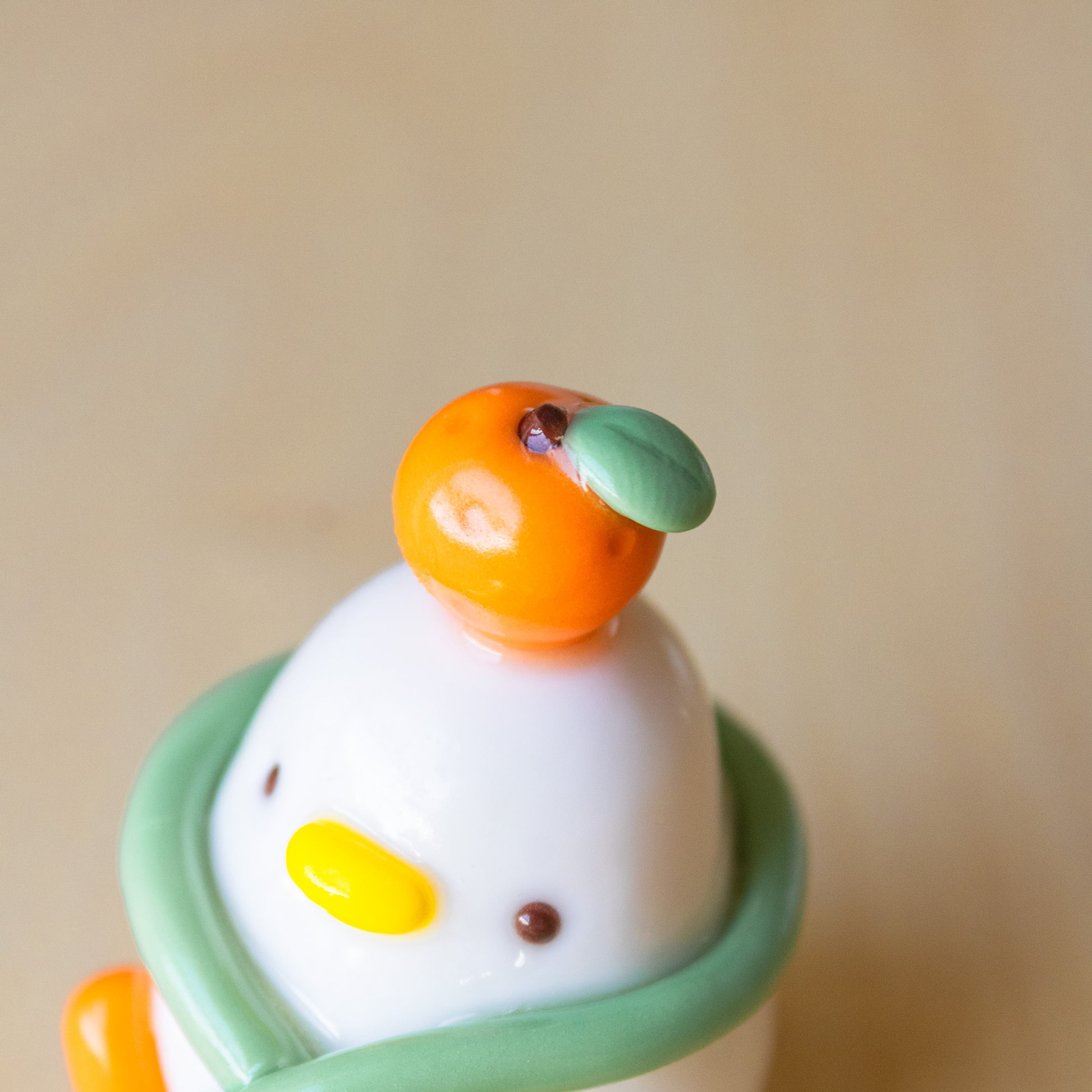 Meet the coziest resident of Mozy Town, the Tangerine Duckie! This little guy is obsessed with two things: his warm scarf and his plump, cute tangerine. He's ready to waddle his way to a new home and add a touch of kawaii, handcrafted coziness to your space.