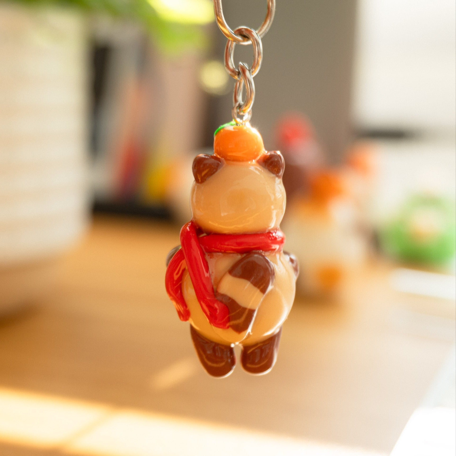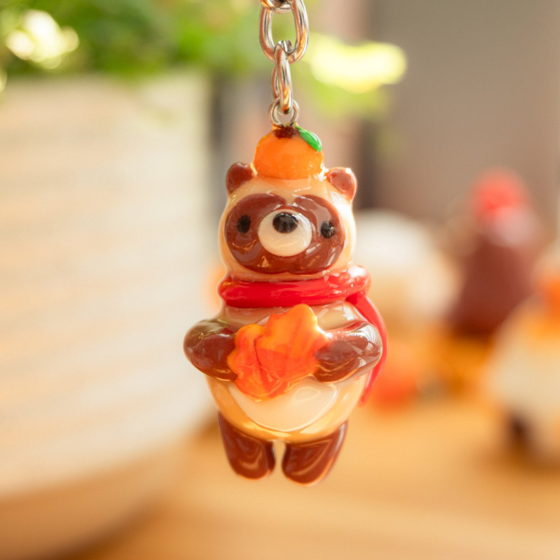 All bundled up in a warm scarf, with a sweet tangerine on his head and colorful fall leaves in his hands, this little tanuki is all about cozy fall vibes! He loves a good pumpkin spice latte and is ready for autumn adventures. This adorable keychain is here to keep you company and bring a little bit of seasonal cheer wherever you go.